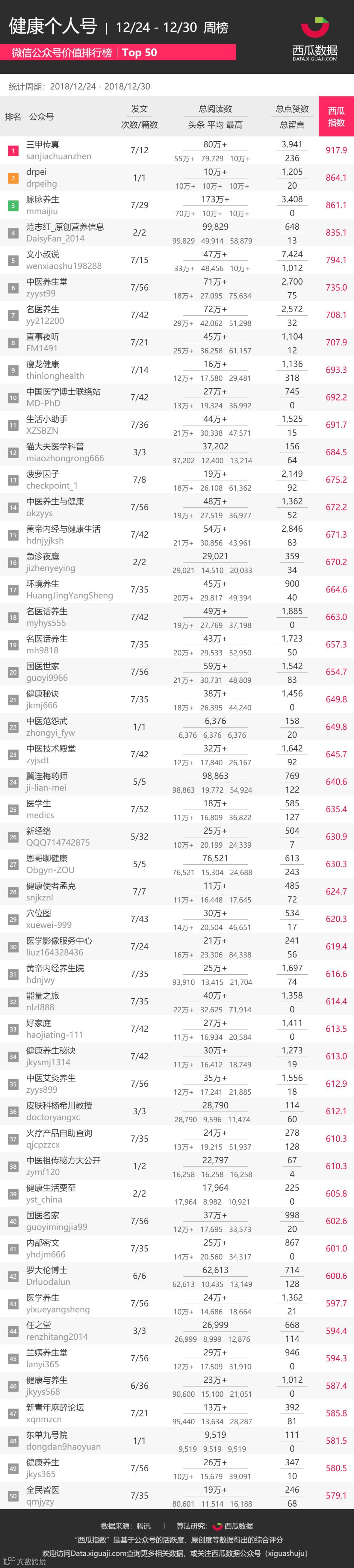 本次公众号排行截取 2 篇健康公众号周榜TOP50,分别涉及: