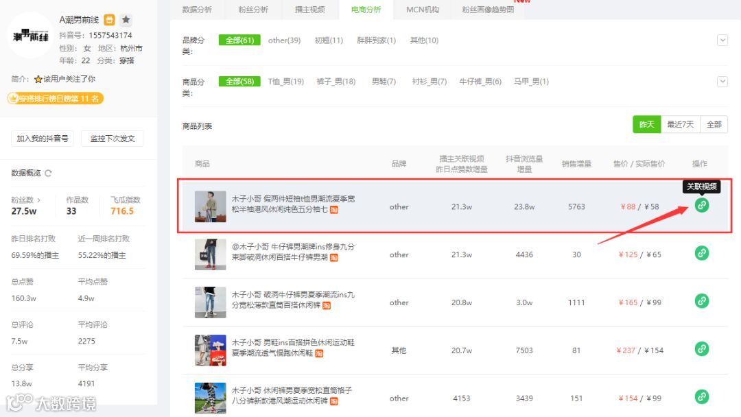 通过观察「A潮男前线」的电商列表,可以发现“木子小哥-假两件短袖t恤男潮流夏季宽松半袖港风休闲纯色五分袖七”这款商品昨日关联视频的点赞激增21.3W,同期该商品的抖音浏览量也达到23.8W,销量增长5763单。