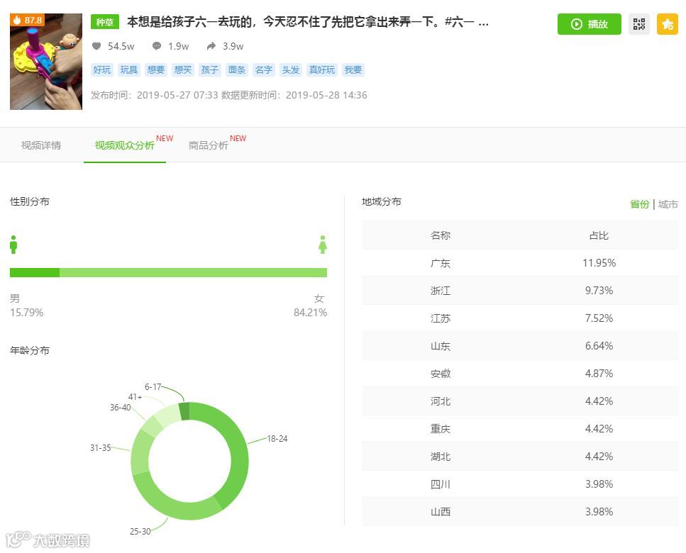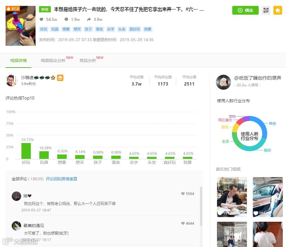 那究竟是什么原有让这个视频火起来呢?通过“视频详情”查看该视频的评论热词:好玩、想要、玩具等,这些关键词间接反应用户观看视频后效果。由此可以判断该视频火的主要原因:主要推广产品结合“六一儿童节”这个孩子们的节日热点,因为产品有趣好玩,大家更容易被种草购买。