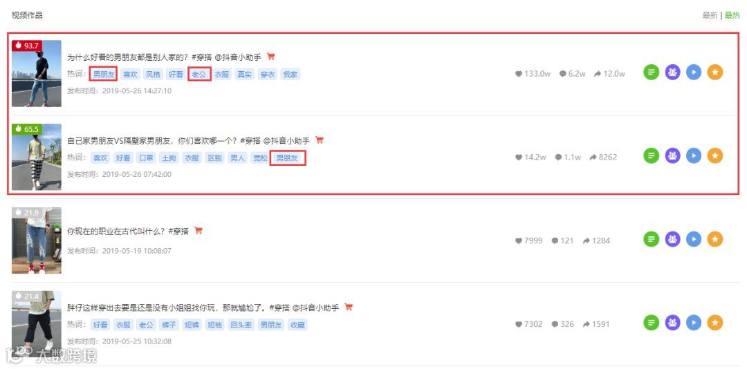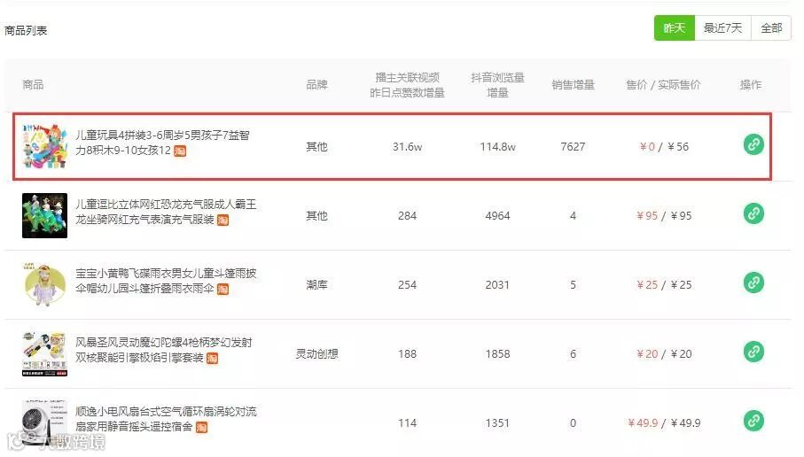 通过「沙雕速💫💫💫⭐」的电商分析类表数据,可以看到儿童积木玩具这款商品的数据表现尤为突出,点击“关联视频”我们发现另外一个情况:该播主为了推广该商品拍摄发布不止一个视频,但是只有5月27日的视频火了。
