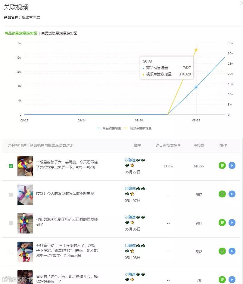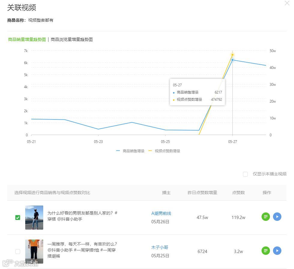 为了进一步确实销量于抖音浏览量的关联度,可以点击“关联视频“,查看”商品的销量趋势图”与播主视频电商增量是否同步近似。