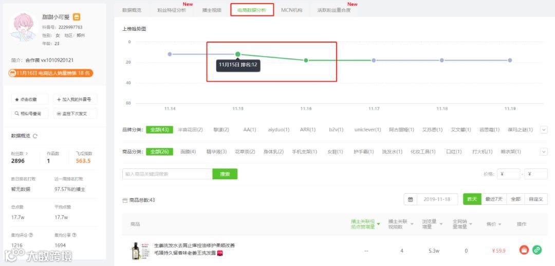 同时,我们查看「甜甜小可爱」近期的电商数据可以发现,仅有2000粉丝的她在15-16号,连续两天登上了抖音电商达人销量榜的第12名和18名。
