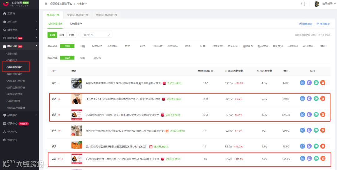 在我们研究双十一的数据的时候,我们就通过飞瓜数据 - 商品排行榜注意到这款黑马“55号粉底刷”。