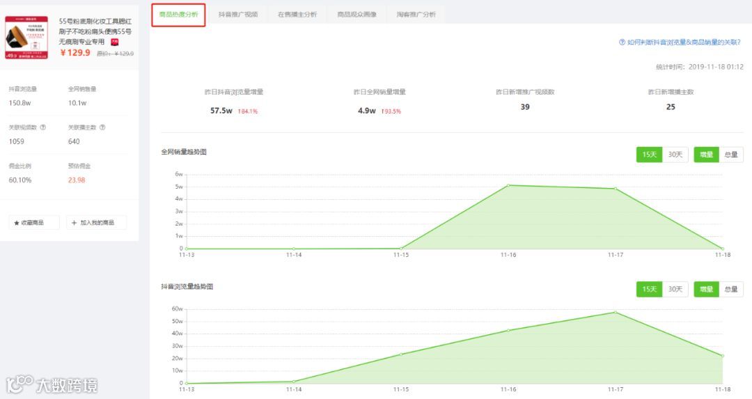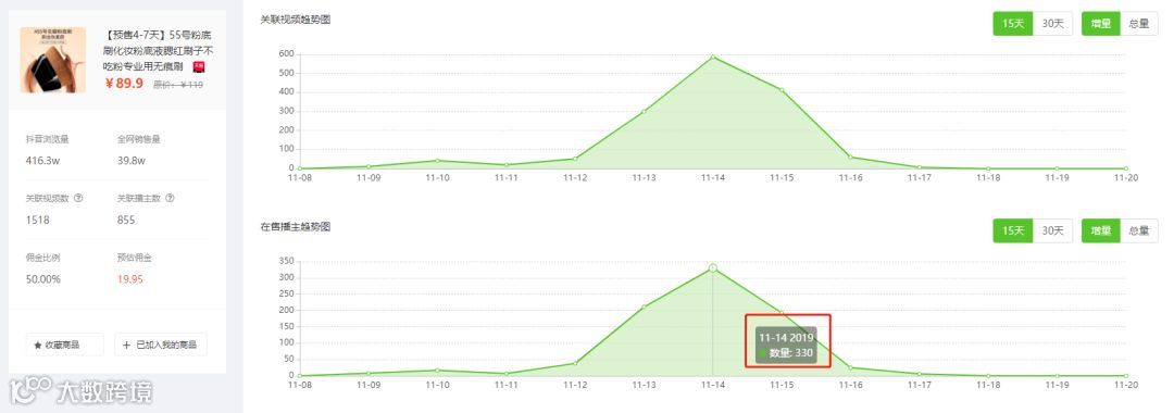 我们选取最早上榜的“55号粉底刷”的商品数据进一步分析,看看它是怎么一步步刷爆抖音的?