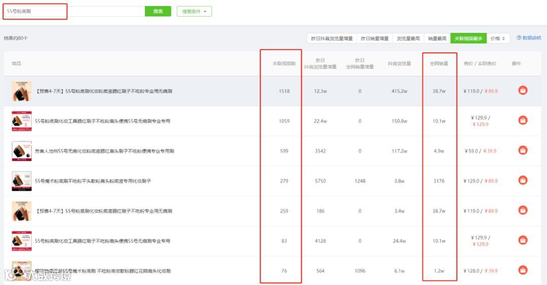 而除了上榜的这3款“粉底刷”产品,我们在飞瓜数据的【商品搜索】中,搜索“55号粉底刷”,可以看到有80款相似的商品,近期在抖音上都进行了大量的推广。