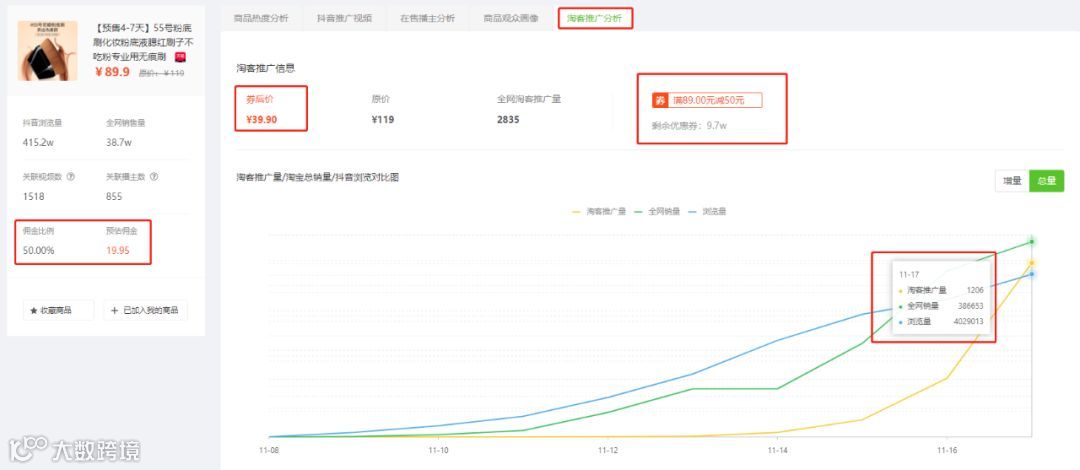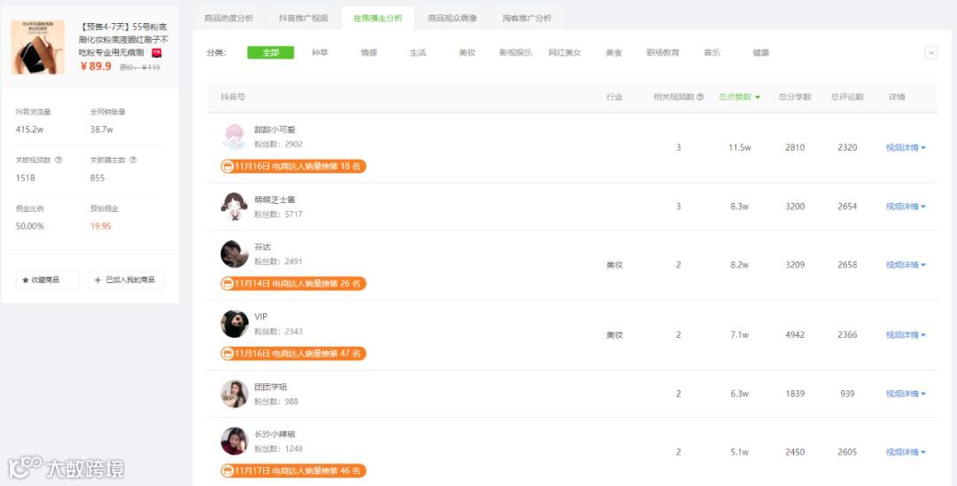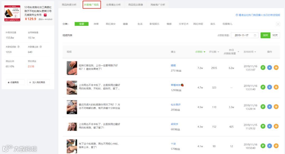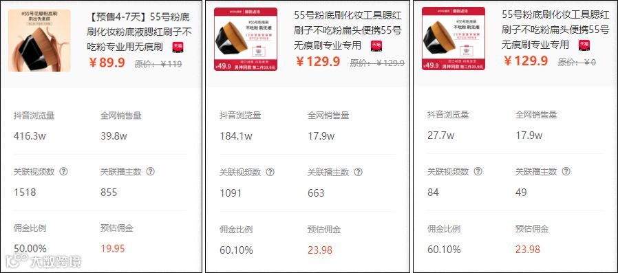 也就是说当“55号粉底刷”在抖音爆单后,淘客寻找市场上相似的商品,在抖音上进行推广,也获得了较高的抖音浏览量和销量增量。