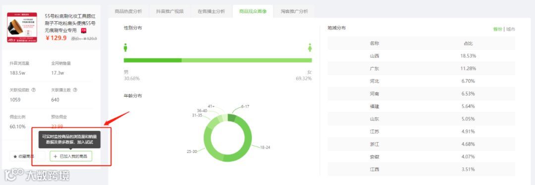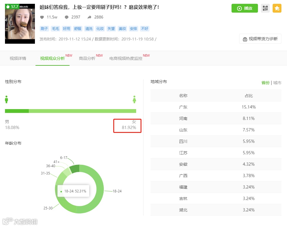 同时通过视频观众分析我们可以发现,这视频内容吸引了大量的女性用户,而且粉丝年龄集中在18-30之间,她们对于正是“粉底刷”的适用用户,这说明视频本身吸引到的用户是非常精准的,能给商品带货带来很大的促进作用。