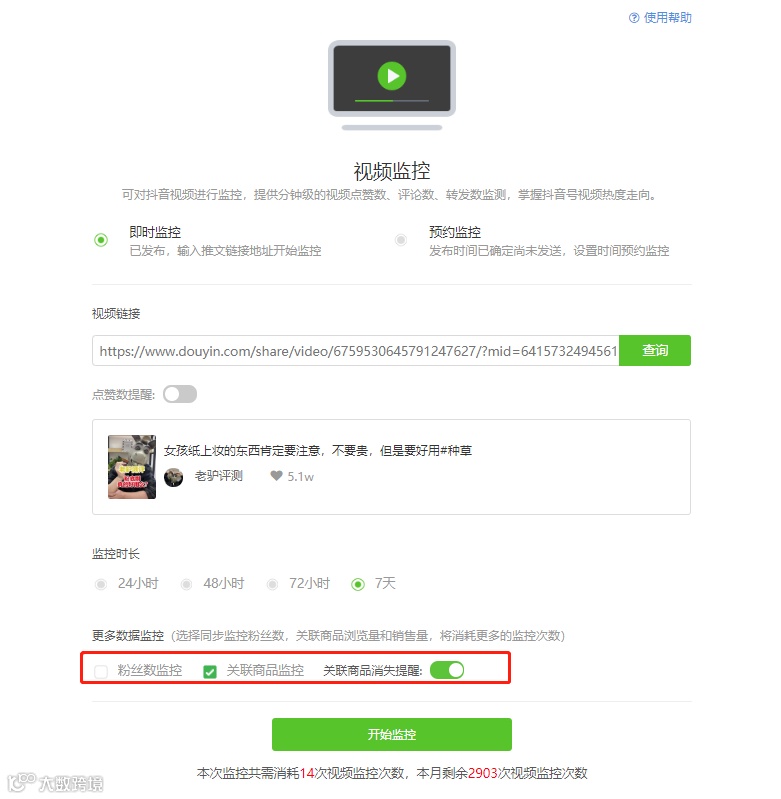 如果想要了解这个带货视频的具体情况,可以对带货视频进行分钟级监控。