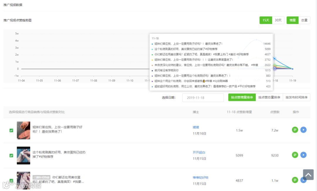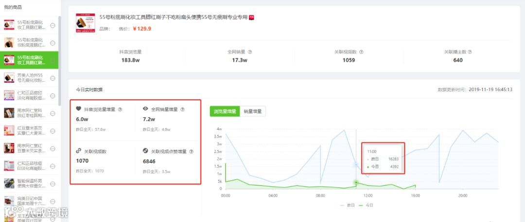 比如我们同期查看11.18该商品关联视频的推广效果,发现看到在当日「媛媛」的“姐妹们答应我,上妆一定要用刷子好嘛?!”带来的曝光量最大,对产品带来的效果更好。