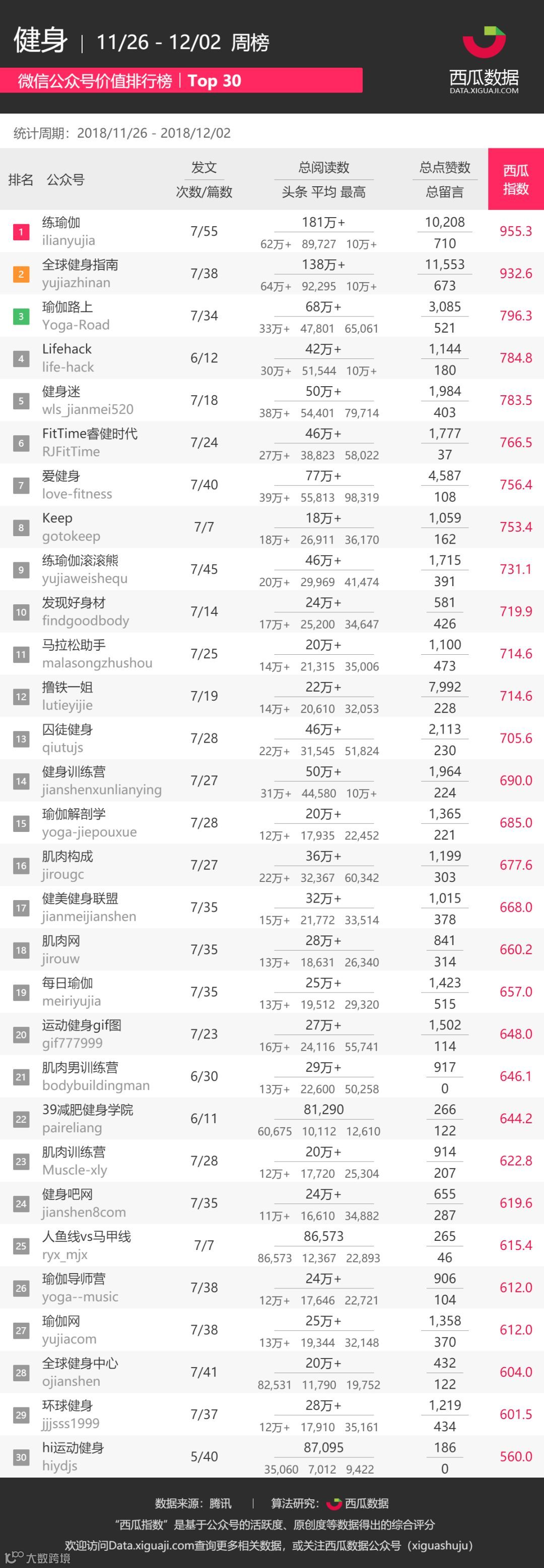 在本期「健身-周榜」中,夺得前三甲的分别是“练瑜伽”、“全球健身指南”、“瑜伽路上”。