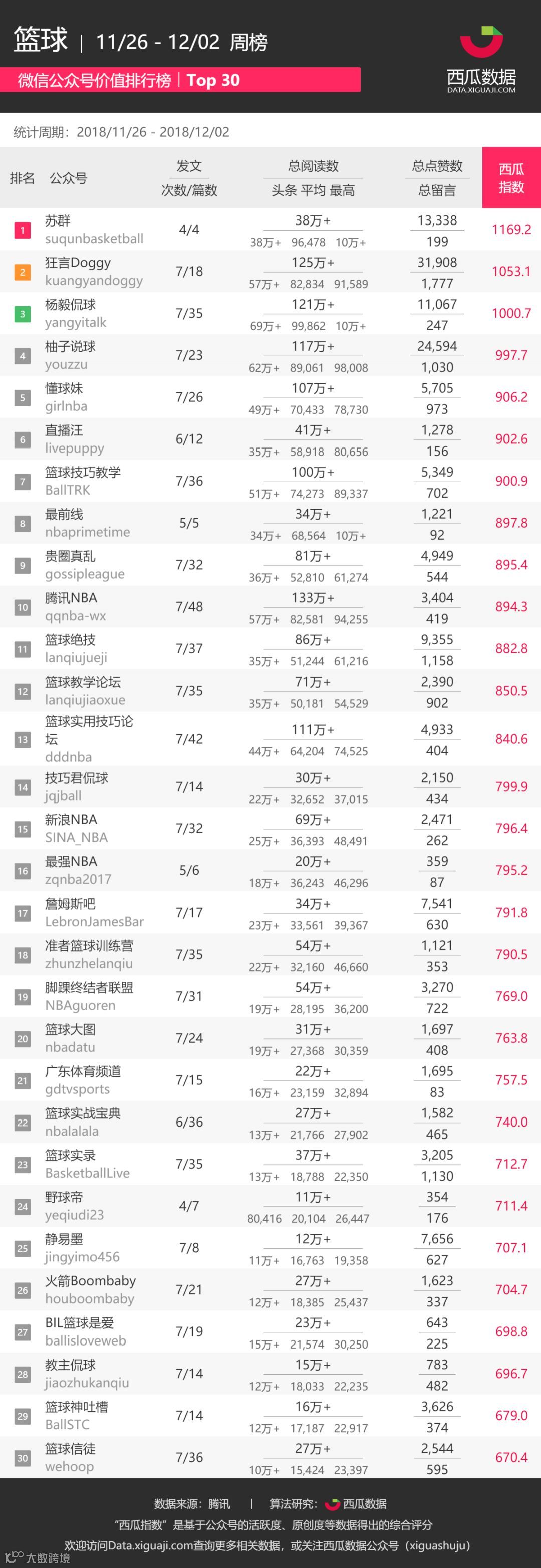 在本期「篮球-周榜」中,前三分别是“苏群”、“狂言Doggy”、“杨毅侃球”。