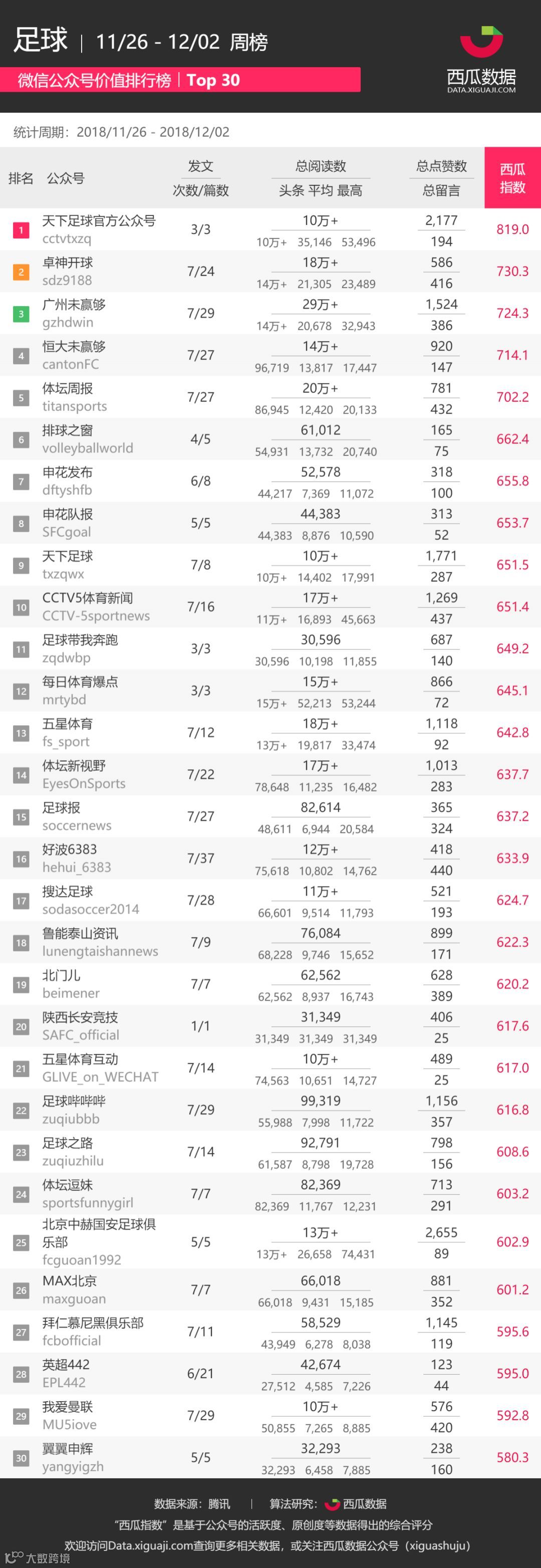 在本期「足球-周榜」中,荣获前三的依次是“天下足球官方公众号”、“卓神开球”、“广州未赢够”。