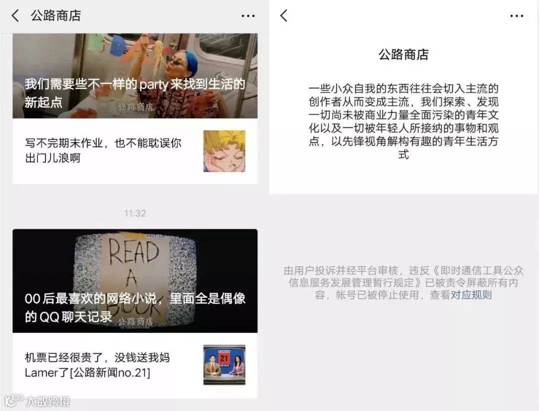 1月11日,公众号“公路商店”所有内容被屏蔽,账号停止使用。同时,该主体下的公众号“公路商店Store”同样遭遇封号,APP也被下架,具体原因暂时不详。