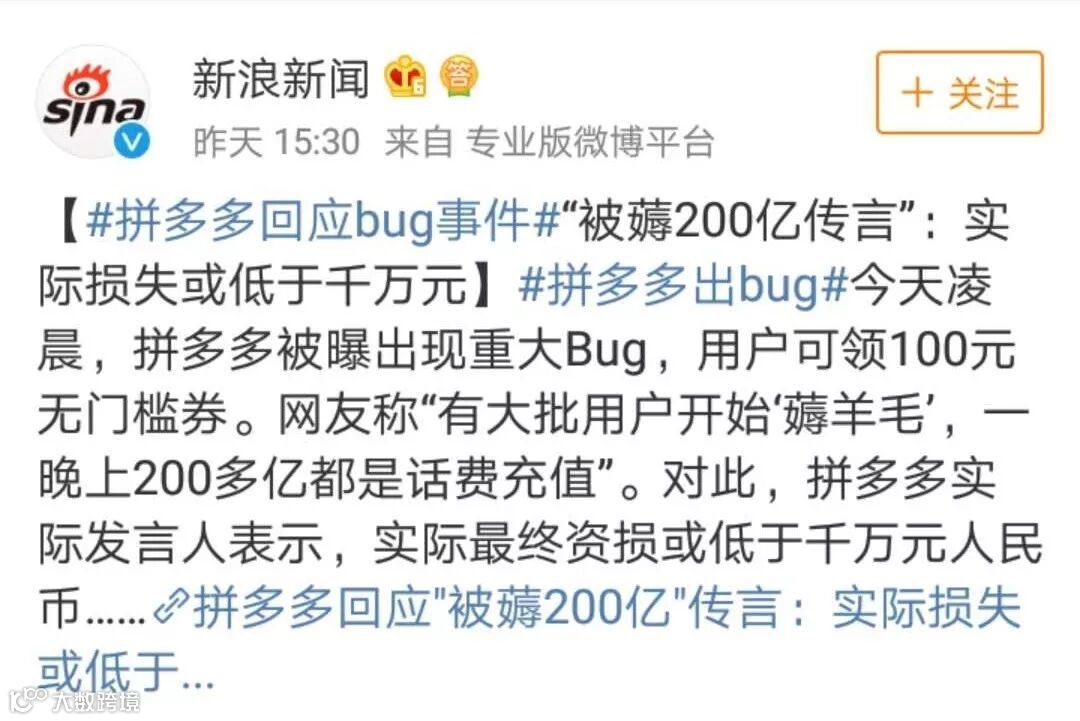 1月20日凌晨,拼多多App因技术漏洞,用户可以领取100元无门槛券。这个消息迅速在“薅羊毛群”散开,大批用户开始用无门槛券充值话费、Q币,购买商品等等。有网友晒出截图,给自己的账户充值了超过50万的Q币。据传,拼多多一夜之间被薅走200亿。对此,拼多多回应称,“实际损失或低于千万元”。