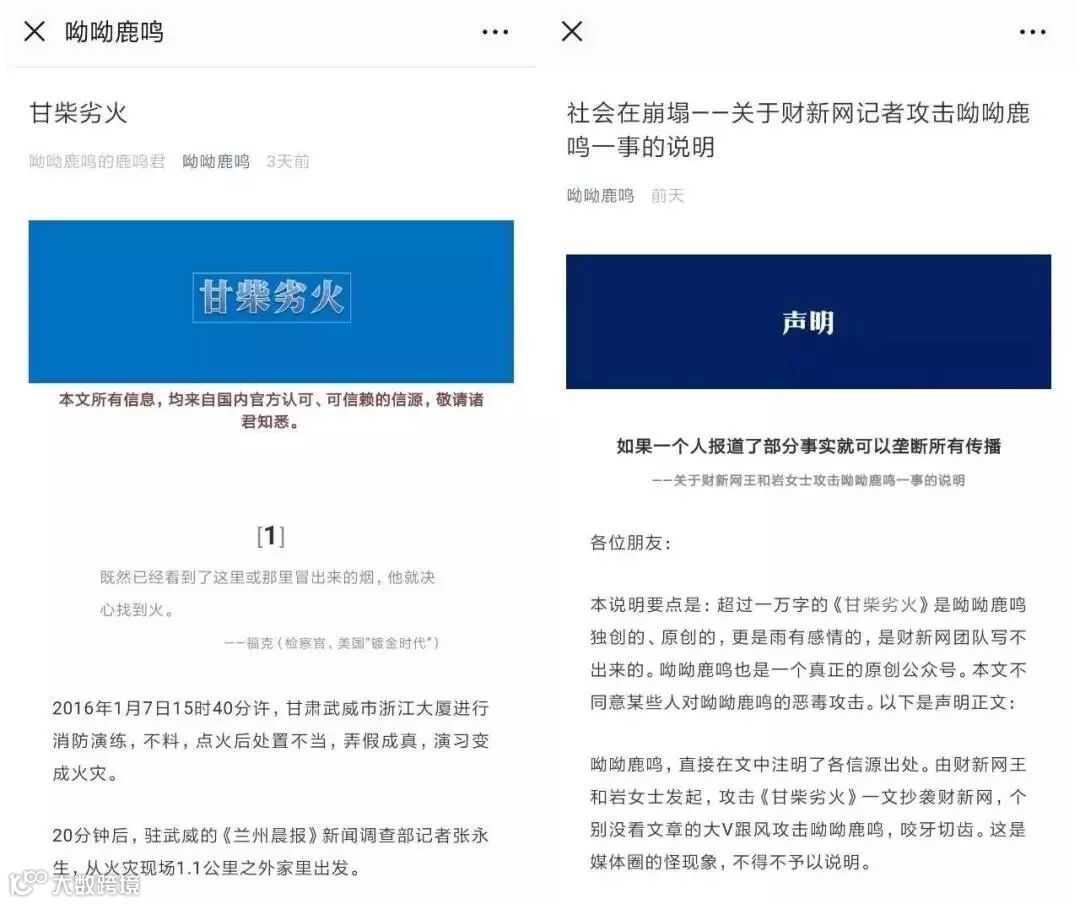公众号“呦呦鹿鸣”1月11日发表文章《甘柴劣火》被财新网质疑洗稿。随后,“呦呦鹿鸣”被取消原创标,冻结赞赏。1月12日,“呦呦鹿鸣”发表文章《社会在崩塌——关于财新网记者攻击呦呦鹿鸣一事的说明》,拒绝删稿。