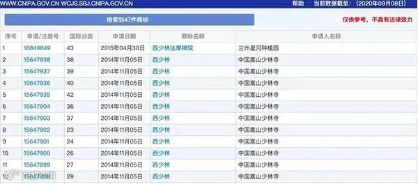 公开信息显示,中国嵩山少林寺近年来进行了广泛的商标布局。从1997年起至2020年9月13日,嵩山少林寺共计申请了666个商标,广泛申请注册“少林寺”、“少林”、“少林功夫”、“少林印象”、“少林生活”等商标,有些甚至是全品类注册(商标注册时有45个类别可选,各类别下又有细分)。