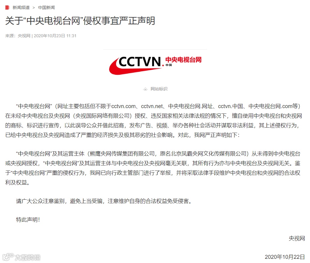 这颜色、英文、排布方式……无不透露出“假冒”的味道。因此,10月22日央视严正声明,将采取法律手段维护中央电视台和央视网的合法权利及权益。