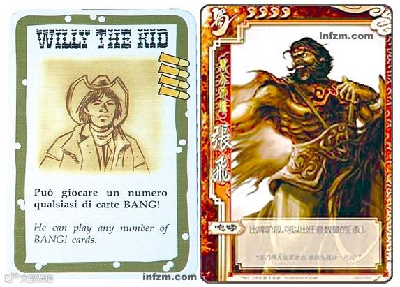 《Bang!》里的“比利小子”(左),能在一轮游戏 里出无限次“Bang!”;与之对应,《三国杀》里的张飞(右),则能出不限数量的“杀”