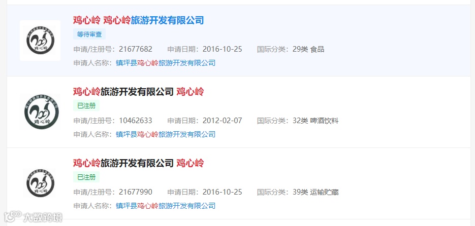 2016年10月25日,镇坪县鸡心岭旅游开发有限公司又在29类“食品”分类上申请了“鸡心岭 鸡心岭旅游开发有限公司”商标,在39类“运输贮藏”上申请了“鸡心岭旅游开发有限公司 鸡心岭”商标。