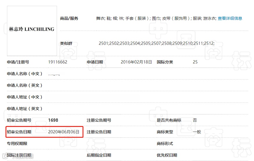 6月6日商标局公告显示,林志玲申请注册的商标“林志玲”和“林志玲LINCHILING”初步审定,商标注册时间为2016年,核定使用在1、3、5、25、26、41类别上。