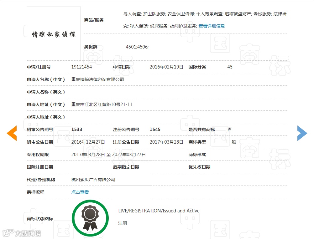 重庆有一家法律事务所,这家公司申请了一枚“情踪私家侦探”商标。这枚商标属于第45类别,商标的核定服务项目为:寻人调查,护卫队服务,安全保卫咨询,个人背景调查,追踪被盗财产,诉讼服务,法律研究,私人保镖、侦探服务、夜间护卫服务。