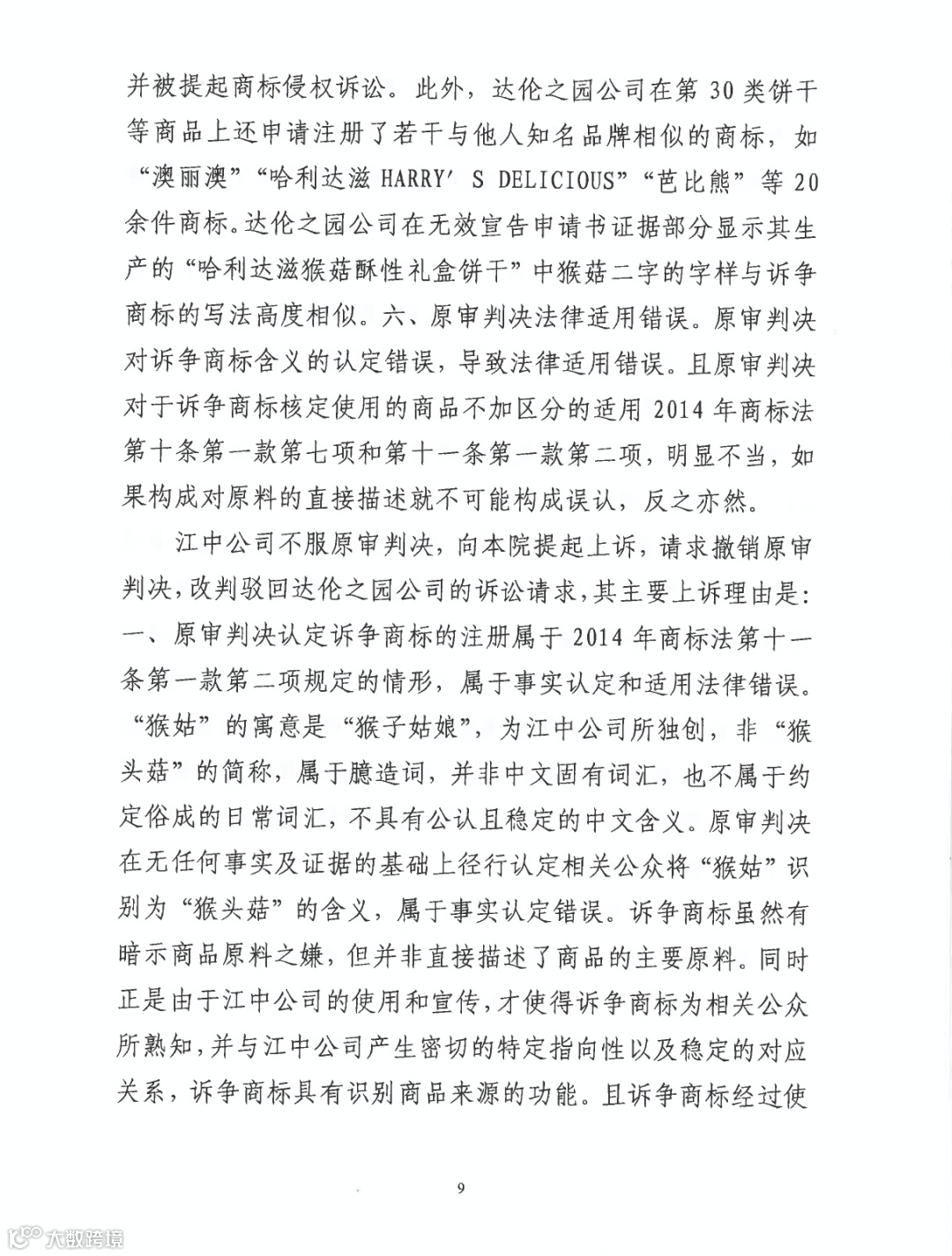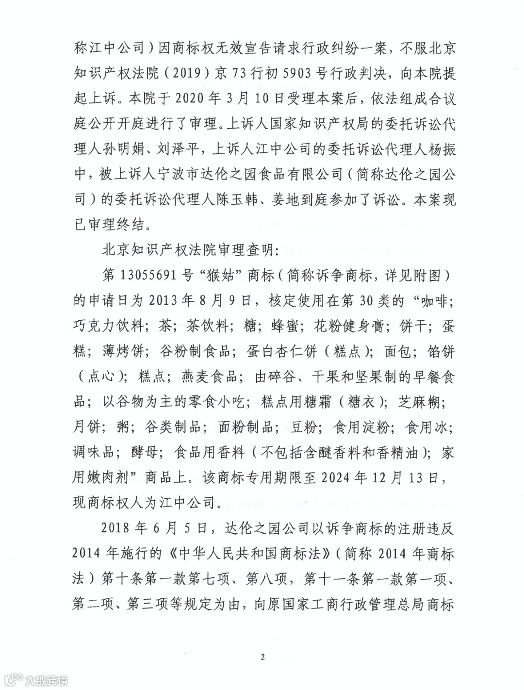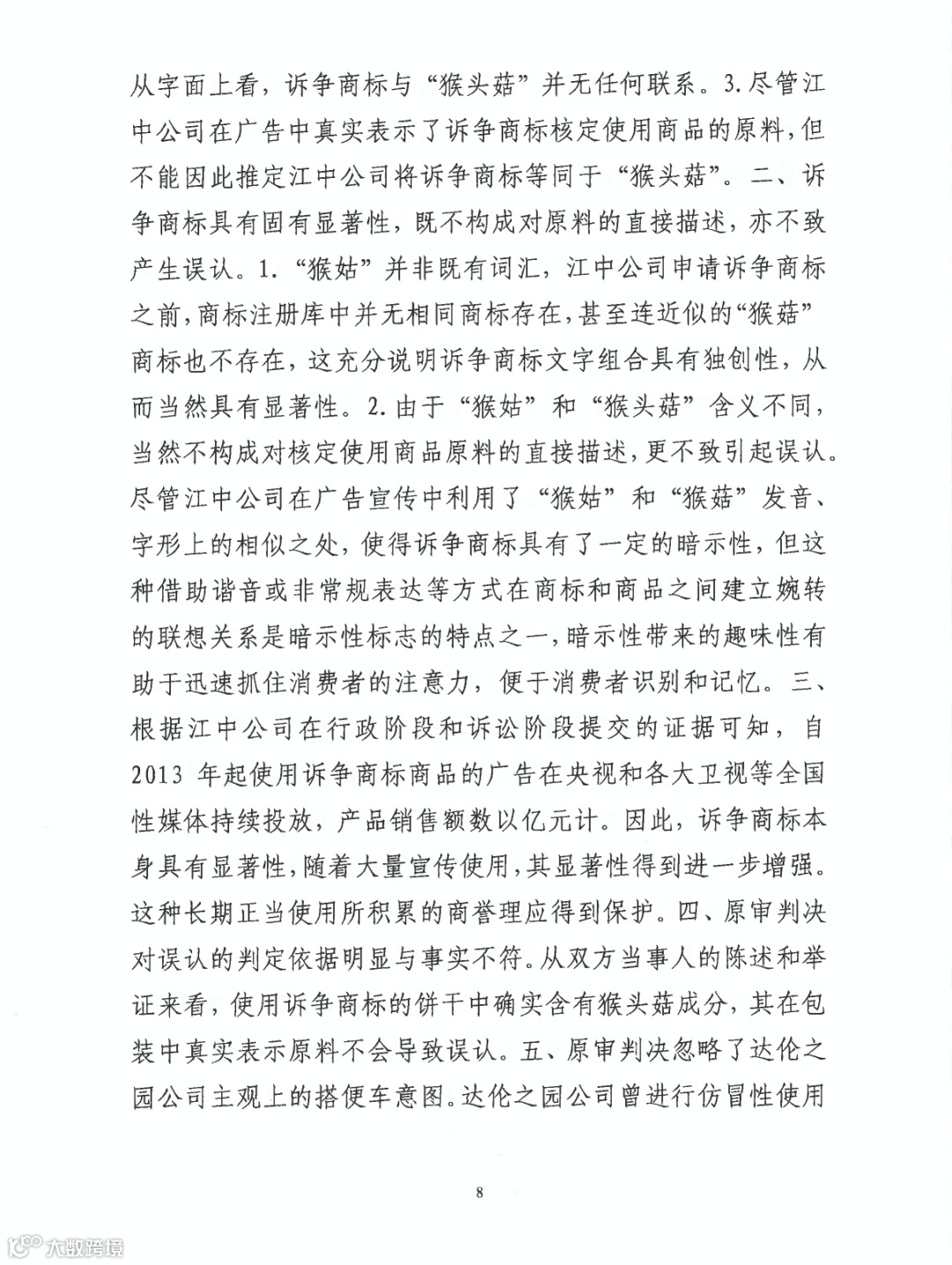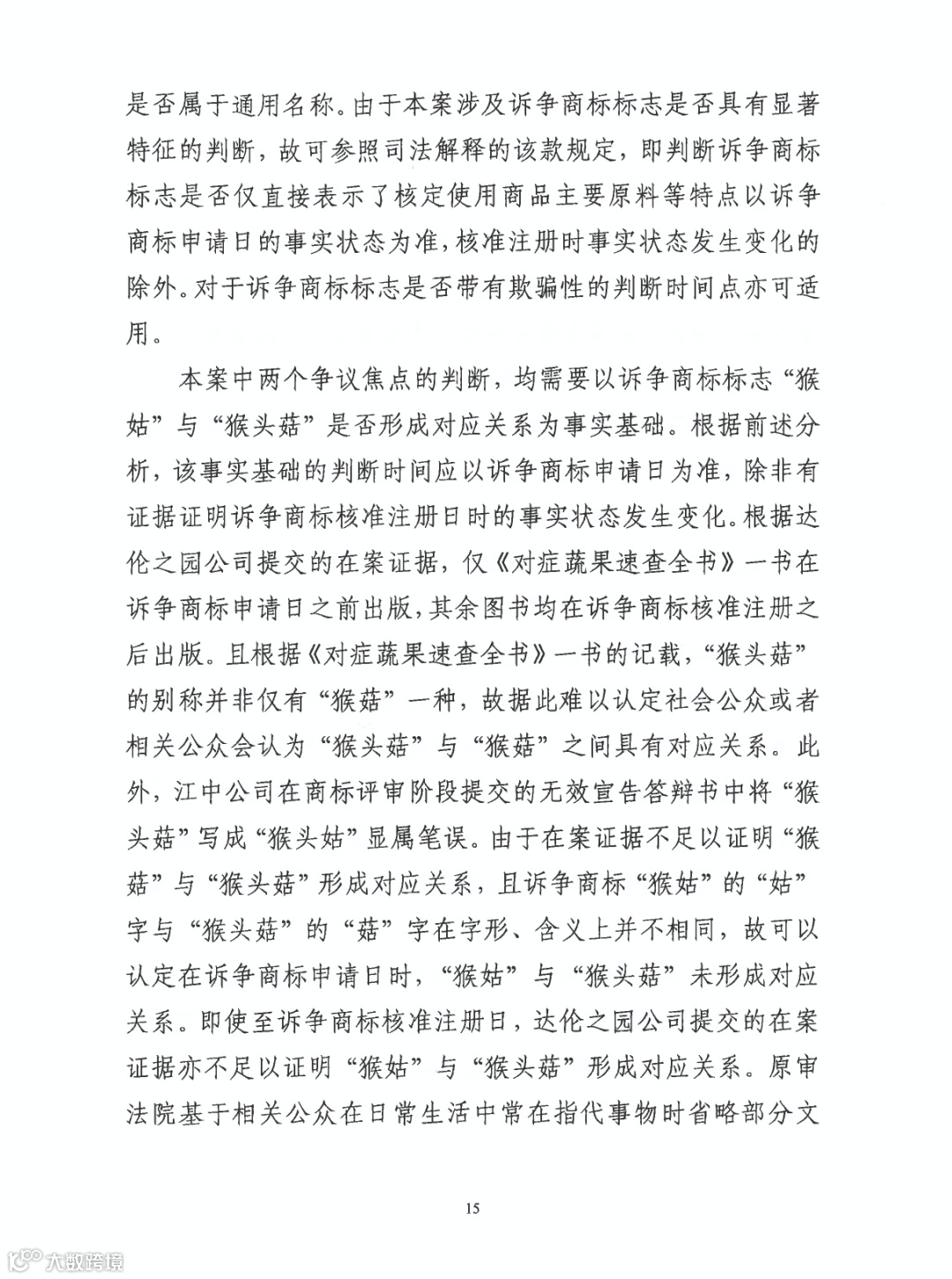 根据《对症蔬果速查全书》一书的记载,“猴头菇”的别称并非仅有“猴菇”一种,故据此难以认定社会公众或者相关公众会认为“猴头菇”与“猴菇”之间具有对应关系...且诉争商标“猴姑”的“姑”字与“猴头菇”的“菇”字在字形、含义上并不相同,故可以认定在诉争商标申请日时,“猴姑”与猴头菇”未形成对应关系...