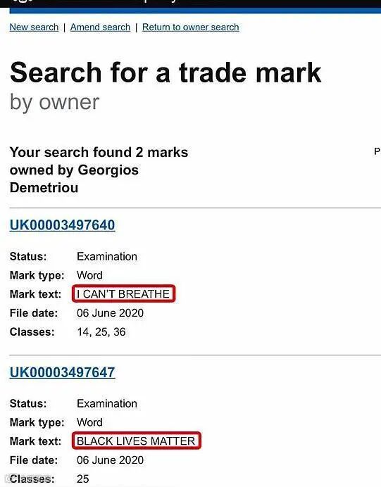 现年57岁的乔治迪米特里欧(Georgios Demetriou) 来自英国曼彻斯特,他在6月6日用两个口号申请注册了商标。乔治弗洛伊德(George Floyd)在美国被杀之后,世界各地纷纷爆发"黑人的命也很重要"的游行,并且将"我不能呼吸"作为口号,因为这是弗洛伊德死前最后说的话。