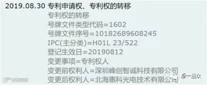 值得关注的是,经查询,此件专利于2019年8月进行了专利权转移,从原专权利权人“上海天马微电子有限公司”,经交易中介,转移至“北海惠科光电技术有限公司”。