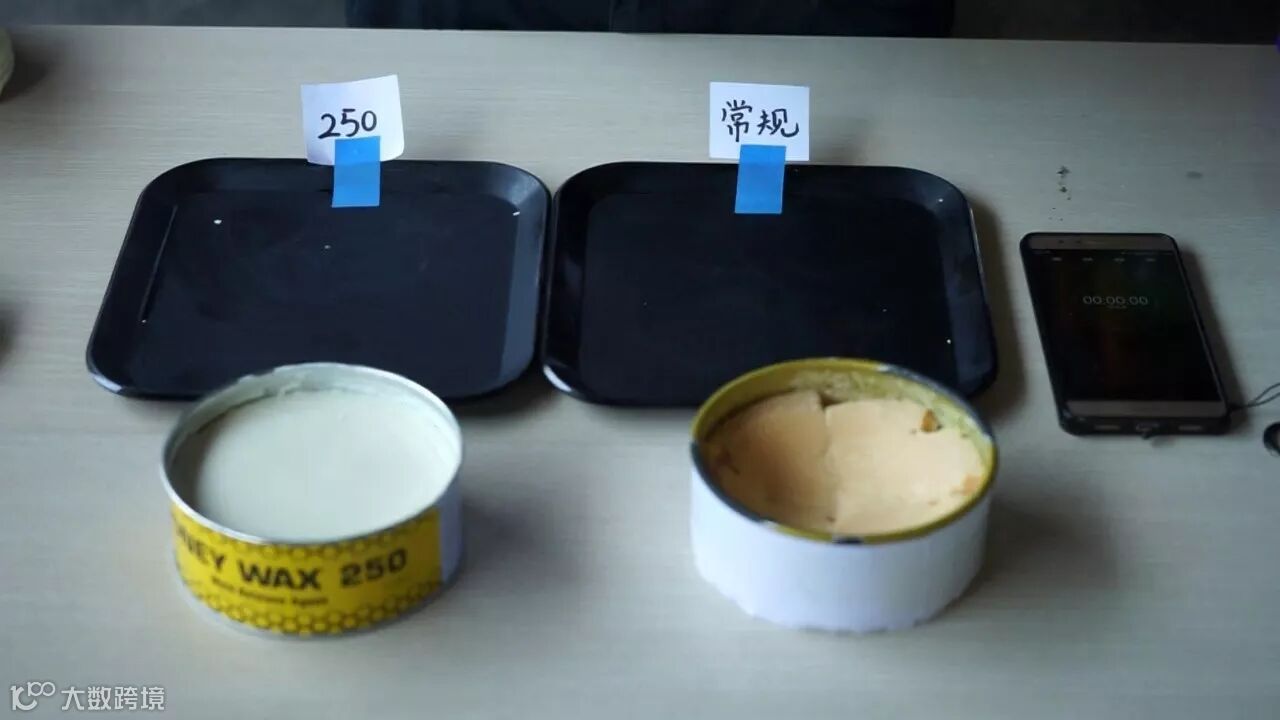 对已涂抹蜜蜡250和常规蜡两种不同脱模蜡的模具表面进行擦拭的对比,为了更直观地看到整个擦拭过程的效果,我们使用计时秒表对整个擦拭过程时间进行实时记录: