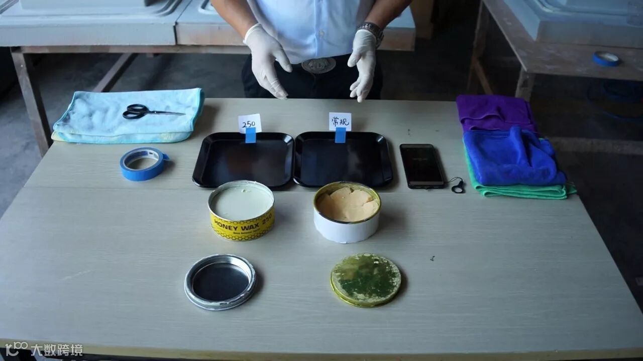 ②蜜蜡250:把模具拿起用布擦拭,使用过程感觉有非常强烈的不同,完全不费力气,轻松快速就把表面的蜡痕迹擦除,擦除后的表面立刻呈现光亮状态。