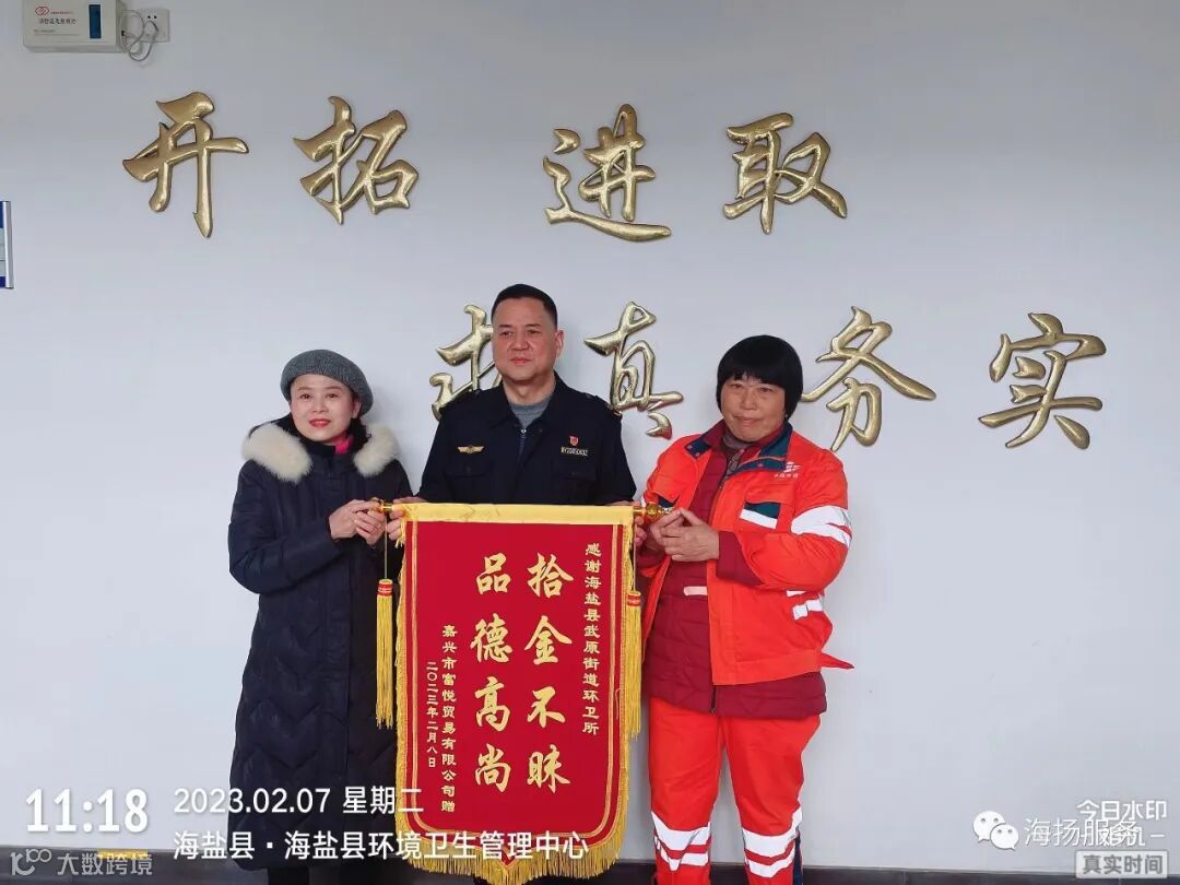 一面锦旗不仅是对王培英的感谢,对海盐县武原街道环卫所的感谢,更是对海扬环境员工队伍拾金不昧高尚品德的赞赏。更是对崇尚社会美德的传承发扬,彰显出文明新风,传递了社会正能量,体现了员工良好的职业道德品行,为广大员工树立了学习的榜样。