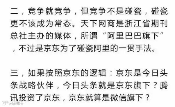 随后,京东对于天下网商给出的“宣战书”进行了补充,称“竞争就是竞争,不需要遮遮掩掩,更不需要欲盖弥彰。”并附上截图证据,指出浙江淘宝网络有限公司占有浙江天下网商传媒有限公司49%的股权,属于“阿里巴巴旗下媒体”。