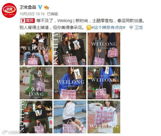 本以为,今年的卫龙会与其它品牌来个大跨界,卖个辣条唇膏、辣条香水、辣条面膜等有关辣条的各种新品类,没想到,等来的却是官宣进军时尚圈,居然还卖起了蛇皮袋?!