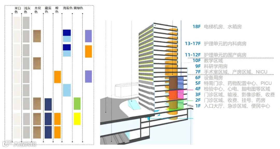 医院色彩设计原理以米色及木纹色为基础色。门诊医技区域搭配明亮的色彩吸引患儿的注意力,空间气氛充满生气。住院区搭配蓝色紫色等宁静祥和的颜色起到安抚作用。