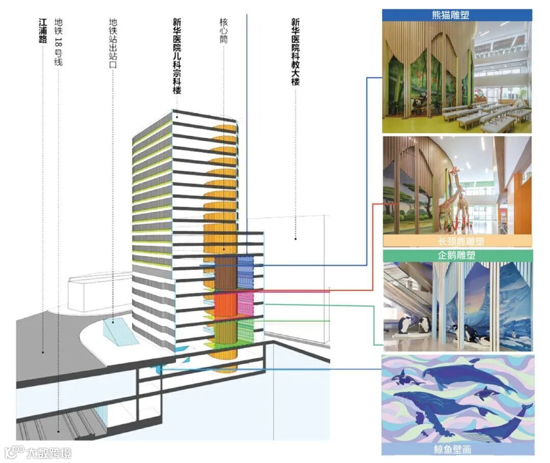 由于市区地块拥挤狭窄,设计在竖长的狭小空间里,通过卡通主题中庭,打破跨层,将就诊空间整合。将壁画与雕塑艺术与建筑融合,在有限的空间内创造人文关怀。