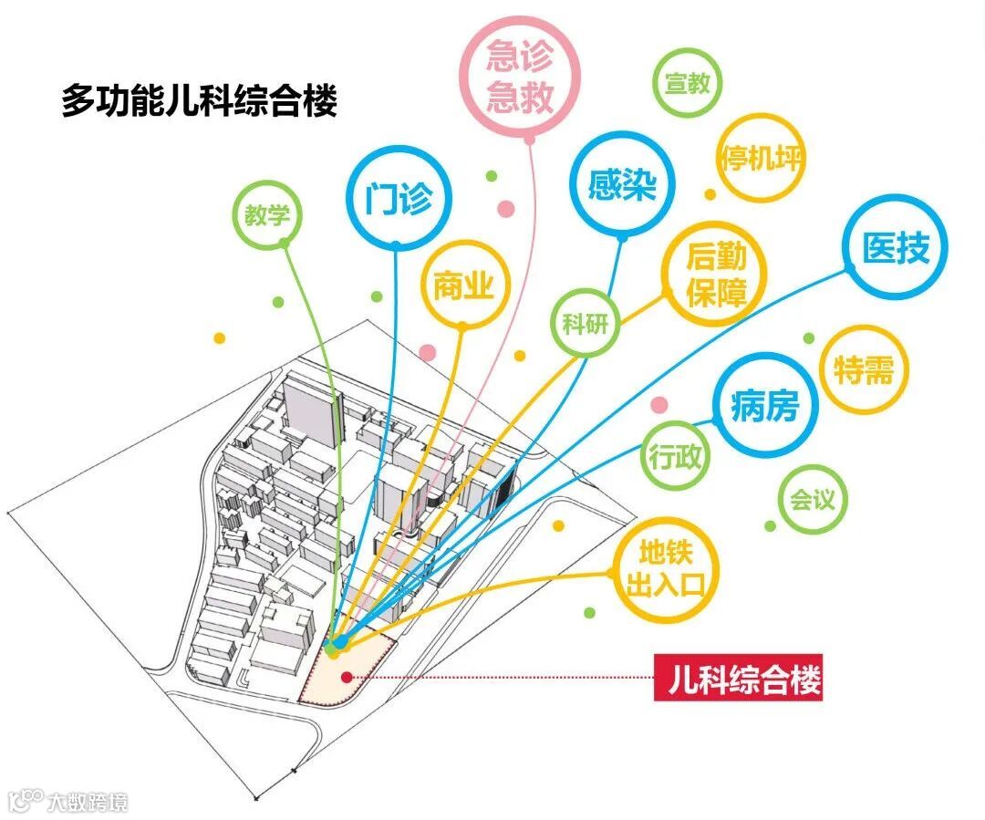 建筑构建整合性医疗服务体系,将儿科急诊、门诊、医技、后勤、病房等功能通过三维骨架紧密联系。高效集约的流线组织,提高了患者就医和医护工作的效率。院区内通过连廊与小儿外科楼连接,形成完整的儿童诊疗区。