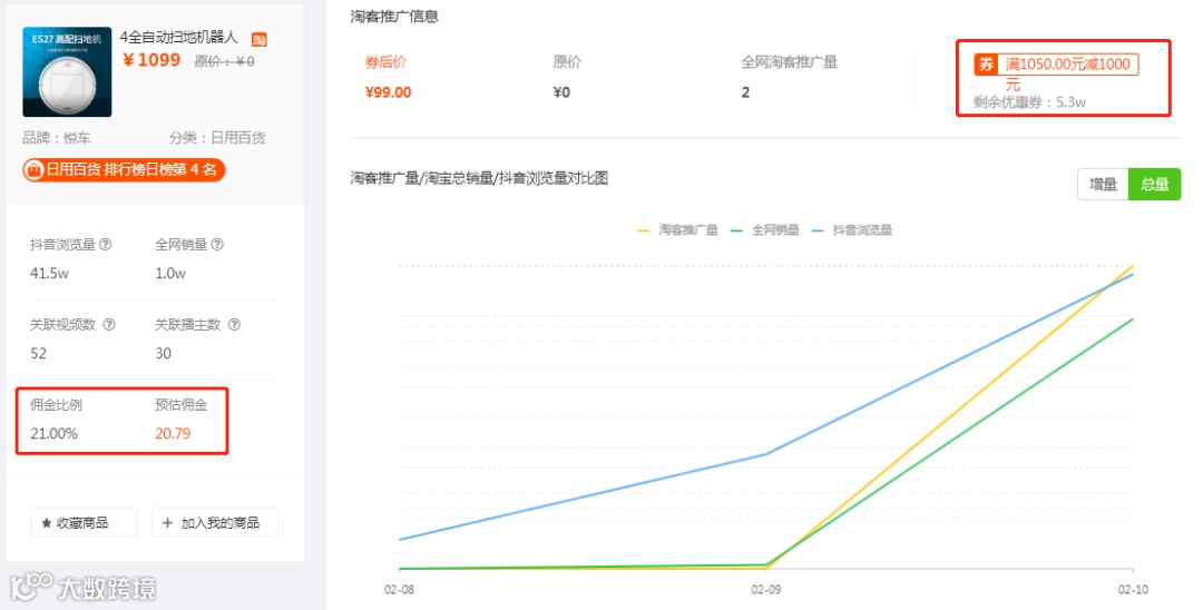 目前这款商品的推广量和销售量依旧在不断增加,预计还将继续有持续的爆单现象。相信最近如果选择这类小型家用电器的话,搭配“大额优惠卷”的推广策略,有可能获得更高的佣金收入。