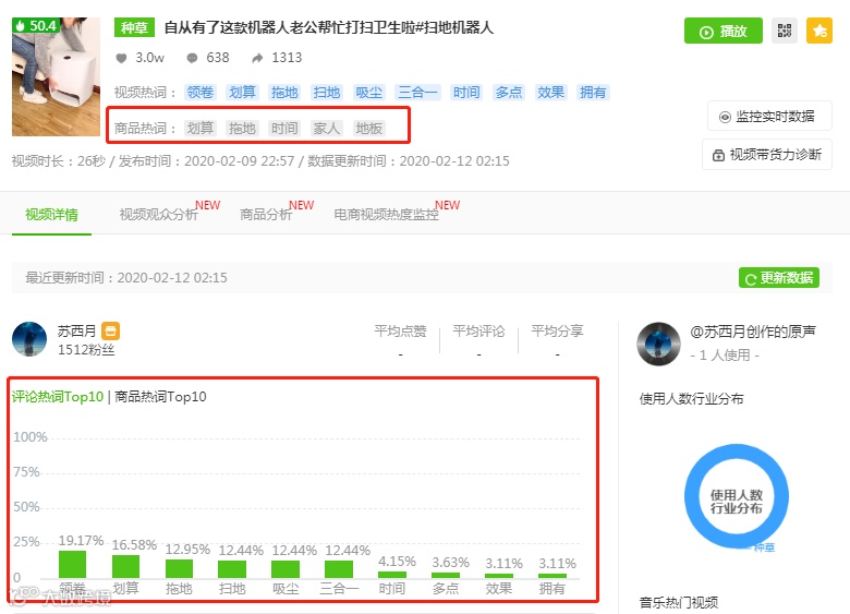 虽然这个视频已经被删掉了,但我们可以通过飞瓜数据的“视频详情页”还原视频的推广数据,我们发现用户的商品热词多以“划算”、“拖地”等正向关键词为主,而且600+评论更是助力视频的热度,正向的评论更是能促进成交。