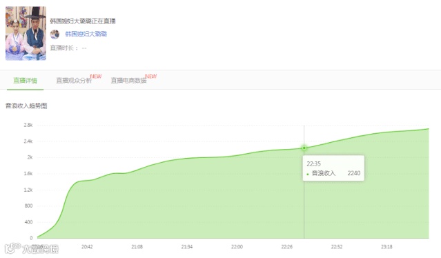 直播详情可分钟级查看账号的音浪收入、人数峰值、弹幕数趋势图,时刻掌握抖音号直播热度变化。