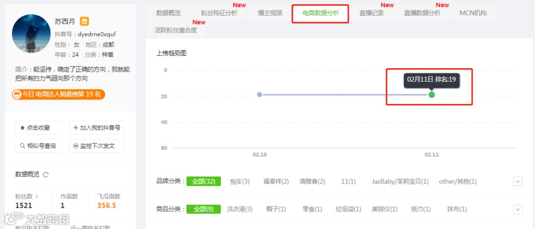 在查看【在售播主分析】的时候我们发现,「苏西月」以1500的粉丝量登上了11号的电商达人销售榜的第19名!