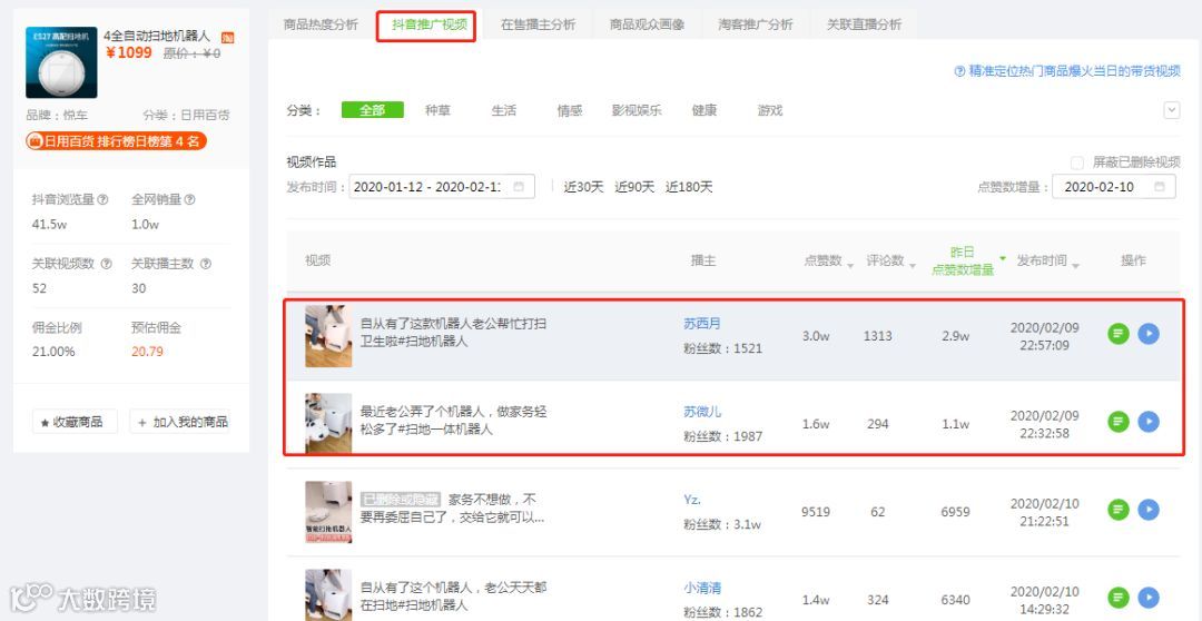 我们看到在10号当天“扫地机器人”的关联商品的视频中,发现商品的抖音推广流量主要来自「苏西月」「苏微儿」的视频。