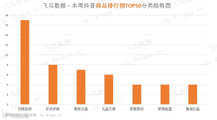 在上周的商品排行TOP50数据中,第一阶梯依旧是热门的日用百货、彩妆护肤,紧随其后的是服饰类和礼品文娱的商品。