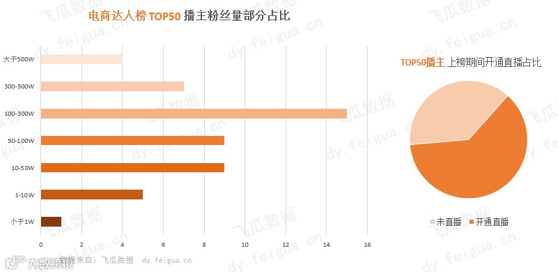 同时,我们通过飞瓜数据的【电商达人销量榜】同步可以查看播主上榜期间的直播销量数据,可以发现超60%的上榜播主都有通过直播带货,可见有很多的抖音电商号,已经开始通过直播红利期的流量带货了!