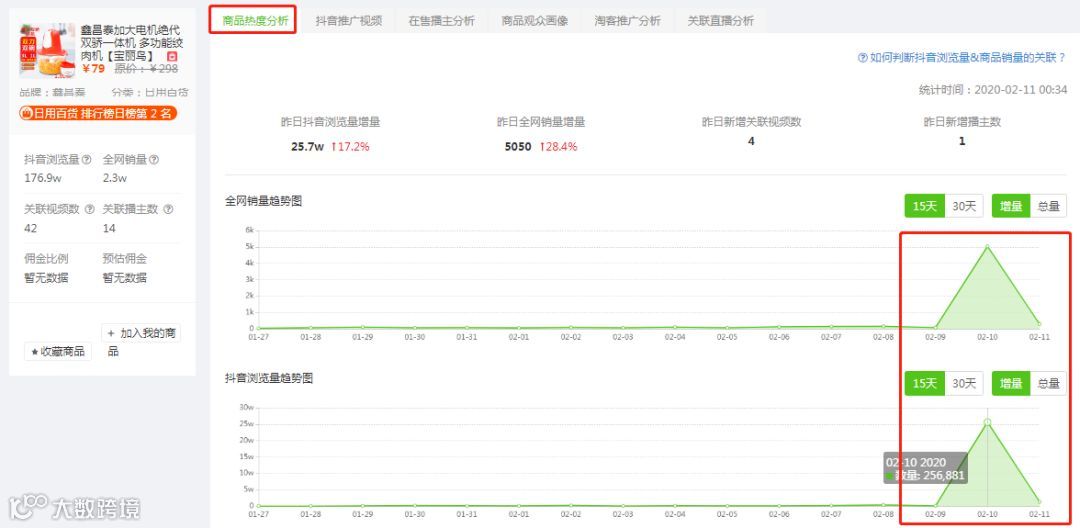 因为飞瓜数据对抖音商品有提前15天的浏览量和销量监控,我们发现“绞肉器”在1.10当天抖音浏览量增加25.7万,销量增长5000单,随着浏览量的增长,销售量同期增长,这就说明这个商品的销量的忽然增加极可能是来自于抖音带货的。
