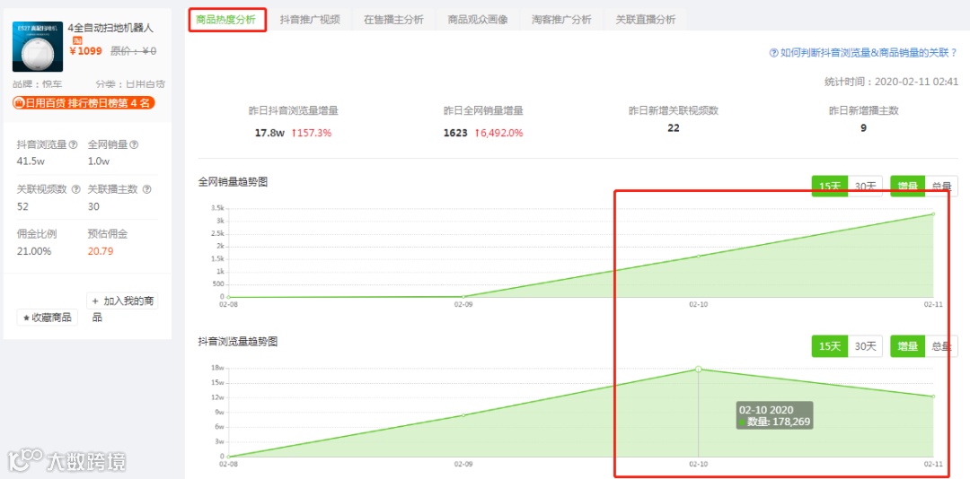 最近抖音上各种小型家用电器的热度很高,我们以这次商品排行榜NO.6的“扫地机器人”为例,分析它的抖音爆火路径。