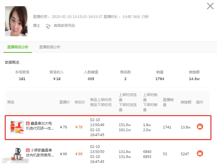 我们点开【直播详情】可以看到该场直播上架了2个商品,我们可以看到销量增量第一的正是前面上榜的“绞肉机”,预估这款商品当天直播销售额超过13.8万。
