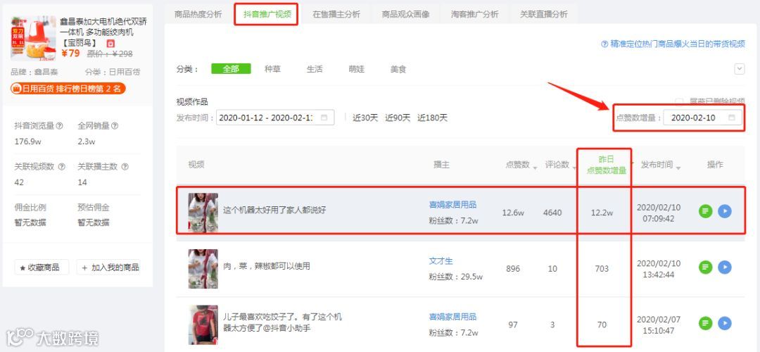 我们发现在10号当天“绞肉机”关联商品的视频中「喜娟家具用品」的视频当日点赞量最高,达到了12.2万,而其他的推广该商品的视频并没有太大的浮动。