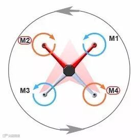 但是当要飞机原地旋转时,我们就可以利用这种反扭矩,M2、M4两个顺时针旋转的电机转速增加,M1、M3号两个逆时针旋转的电机转速降低,由于反扭矩影响,飞机就会产生逆时针方向的旋转。