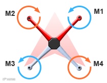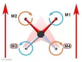 如下图所示,三角形红箭头表示飞机的机头朝向,螺旋桨M1、M3的旋转方向为逆时针,螺旋桨M2、M4的旋转方向为顺时针。