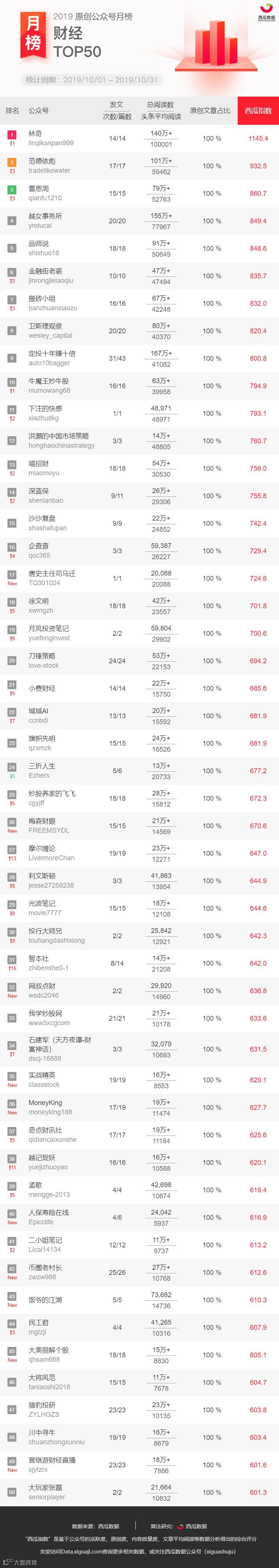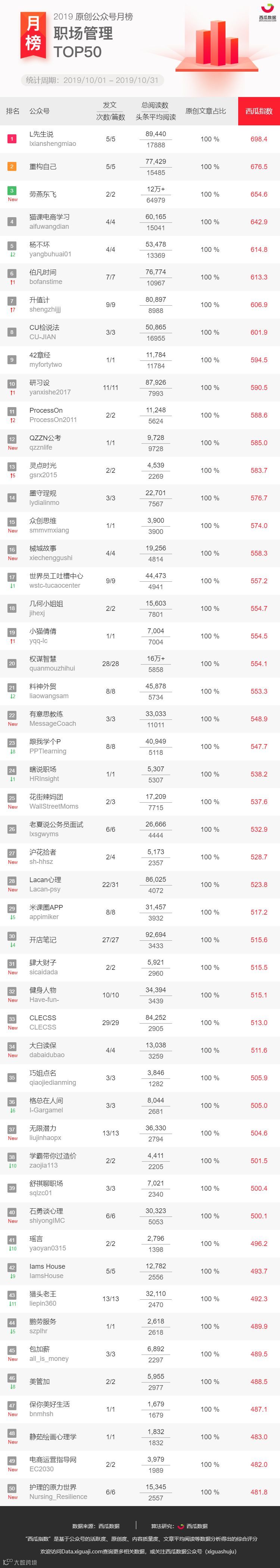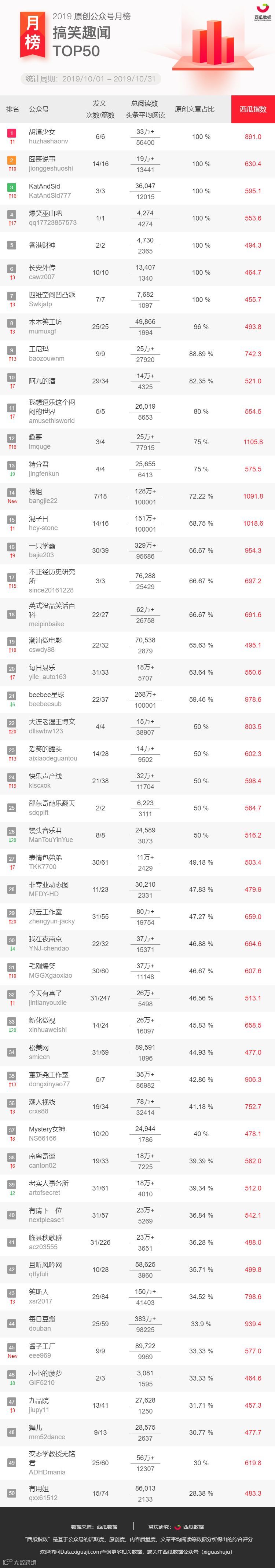 西瓜数据发布 2019 年 10 月原创公众号排行榜,分别从西瓜指数、原创文章占比、周期内公众号发文次数、发文篇数、总阅读数、头条平均阅读数等方面展示公众号数据。
